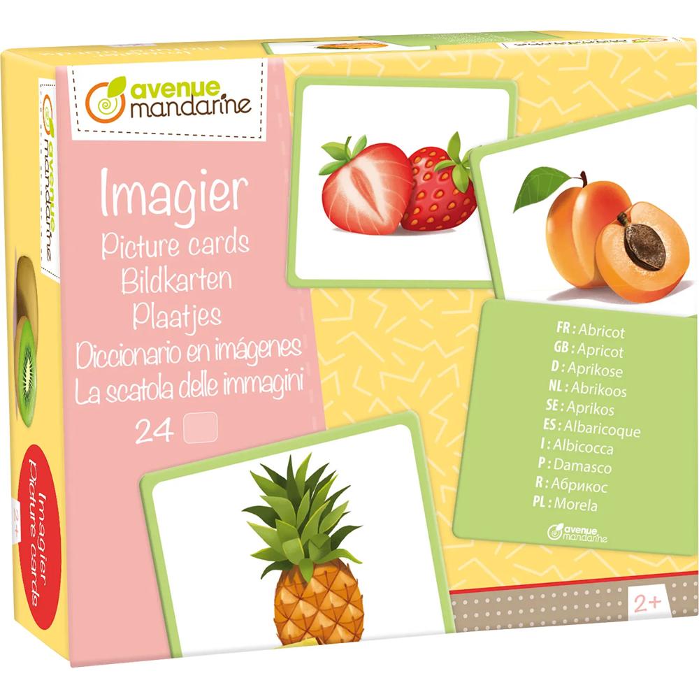 Très bel imagier composé de 24 images cartonnées magnifiquement illustrées. Sur une face : un fruit ouvert et fermé qui permettra à l'enfant de voir lesquels contiennent des noyaux. Au dos le nom du fruit en 10 langues leur permettra de s'initier à la langue choisie avec l'aide d'un adulte.