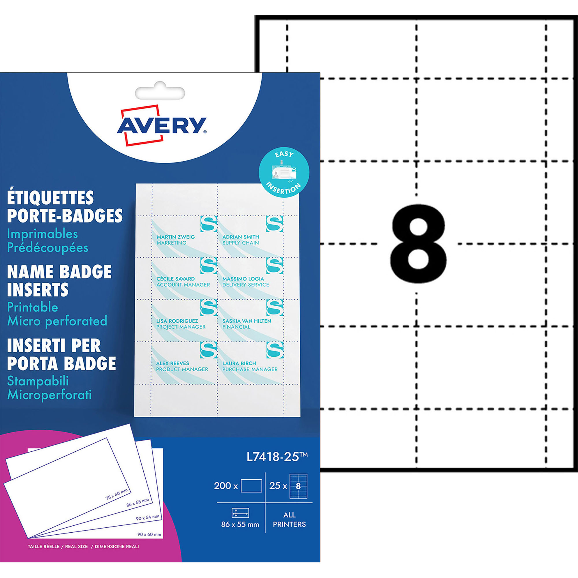 Réutilisez vos badges avec les inserts micro-perforés de qualité carte Avery. En planche A4, ce produit est facilement personnalisable manuellement au stylo ou imprimable à l’aide des modèles et logiciels gratuits disponibles sur www.avery.fr. Le code logiciel à utiliser est L7418. Compatible impression jet d'encre, laser et copieur. Fabriqué à partir de papier blanc 190 g/m², c’est un modèle résistant.