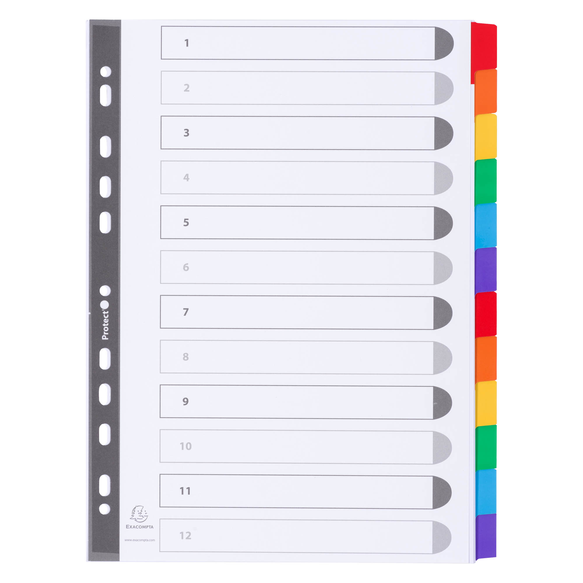Intercalaires carte blanche 160 g avec onglets couleurs renforcés, 12 divisions pour format A4. Onglets extra-larges réinscriptibles.