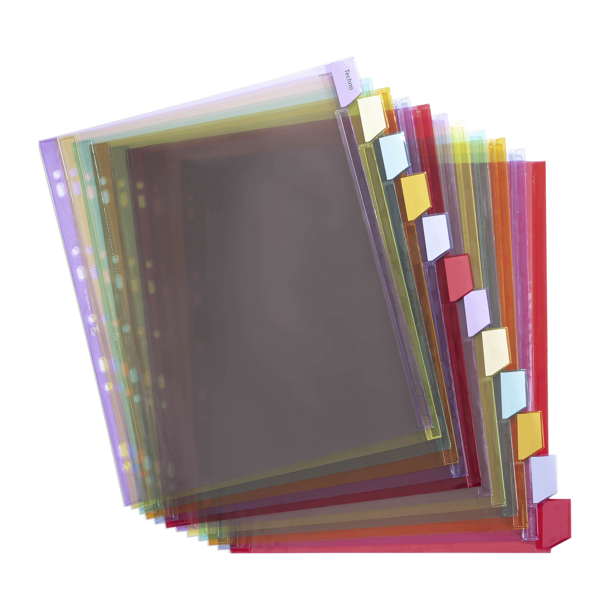 12 onglets neutres translucides colorés (6 couleurs différentes), personnalisables par insertion de bristols pré-découpés fournis.