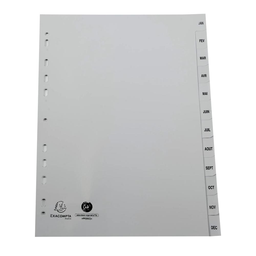 Optez pour une organisation efficace et écologique avec les intercalaires imprimés mensuels PP recyclé gris Janvier-Décembre - 12 positions - A4 - Gris d'Exacompta. Ces intercalaires sont conçus spécifiquement pour les professionnels souhaitant classer et séparer leurs documents par mois, de janvier à décembre, dans un format A4.