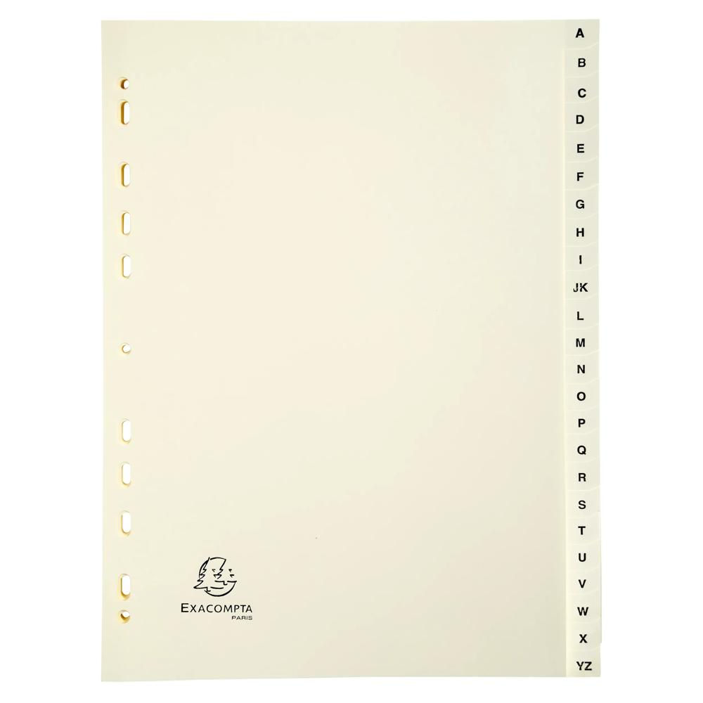 Optimisez l'organisation de vos documents grâce aux intercalaires imprimés Carte peau 155 g 24 positions de A à Z - A4 - Ivoire, conçus par la marque Exacompta, reconnue pour la qualité de ses fournitures de bureau. Élégants et résistants, ces intercalaires sont fabriqués en France à partir d'une carte de qualité peau, offrant un toucher satiné agréable et une excellente durabilité.