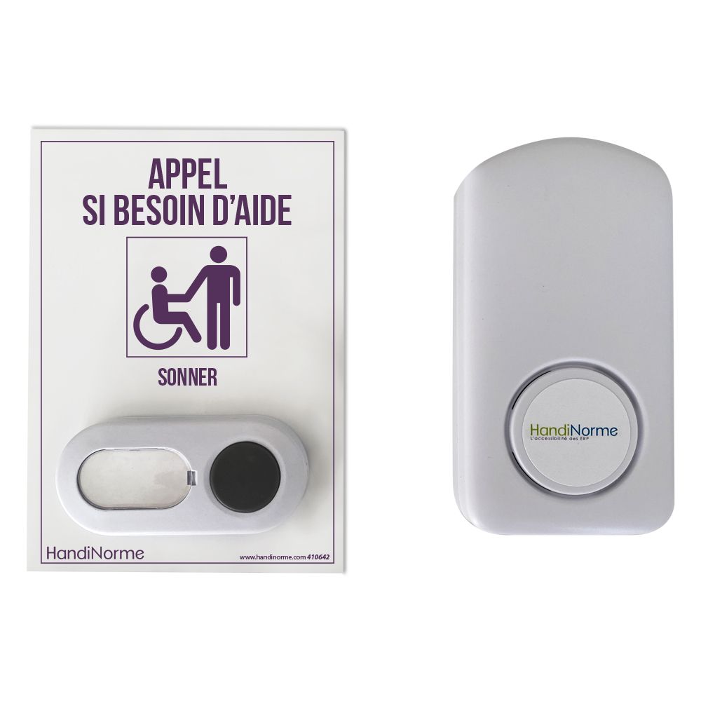 Composé d'un carillon d'appel, d'une sonnette et d'une plaque signalétique, notre kit permet aux personnes à mobilité réduite de signaler leur présence à l'entrée de votre établissement lorsque vous recourez à une rampe amovible.