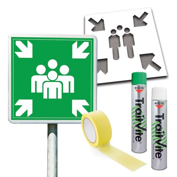 Assurez la sécurité de tous en cas d'urgence avec le Kit - Point De Rassemblement - Avec Pochoir + Panneau Couvre-chant + Poteau + Peintures. Ce kit complet vous permet d'aménager une zone de rassemblement clairement identifiable et conforme aux normes en vigueur, pour faciliter l'évacuation et le regroupement des personnes lors d'une situation d'alerte (incendie, explosion, fuite de gaz toxique, etc).