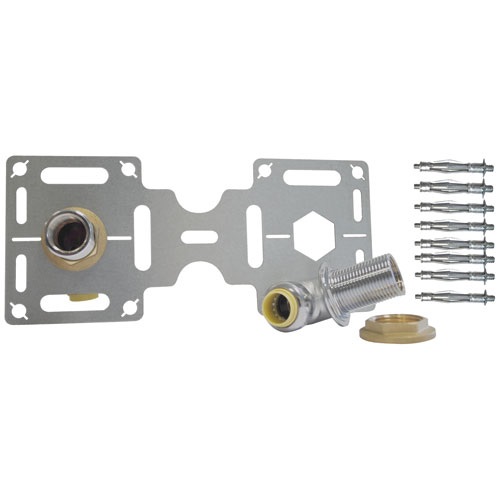 Le kit platine de raccordement de douche Toutub pour cloison plaque de plâtre de diamètre 16 de chez Boutté est en laiton. Le raccord femelle 15x21 (1/2"), le mâle 20x27 (3/4"). Une tenue en pression de 16 bars, une température maximum 80°C. Comme leur nom l’indique, les raccords TOUTUB permettent de connecter entre eux des tubes cuivre, multicouche et PER sans outils et en toute sécurité. Ils conviennent aussi bien pour une rénovation, une extension, qu’une installation complète. 1 seul raccord pour 3 types de tubes, le raccord se montant sans outils, installation rapide, démontables et réutilisables. Montage sur tube cuivre, insérer le tube dans le raccord jusqu'au contact de l'anneau en acier inox. Puis pousser en exerçant une rotation jusqu’en butée. Après le Clic, c'est installé. 100% étanche grâce au joint torique (EPDM). Stabilité, joint en acier inoxydable à griffe conçu pour empêcher l'arrachement du raccord. Solidité, corps en laiton, le raccord peut être peint. Pratique, même installé, le tuyaux reste libre en rotation permettant une installation dans les endroits exigus. Si vous utilisez des tubes PER ou multicouche vous devez mettre en place l'insert adapté avec la connexion. Préparation du tube, après avoir percé 2 trous de diamètre 63 mm à l'aide d'une scie cloche (entraxe 150 mm), sortir les tubes, les couper à la bonne longueur, ébavurer, chanfreiner et calibrer en 1 seul geste. Insérer chaque coude dans le trou de l'hexagonal de la platine. Le 6 pans empêche alors le coude de tourner, quel que soit le sens d'arrivée du tube. Visser le contre-écrou sur le coude. Positionner la platine à l'aide d'un niveau à bulle, ou grâce au 4 petits trous horizontaux, à l'aide d'un niveau laser. Percer les 8 trous dans la cloison en veillant à ne pas percer les tubes.