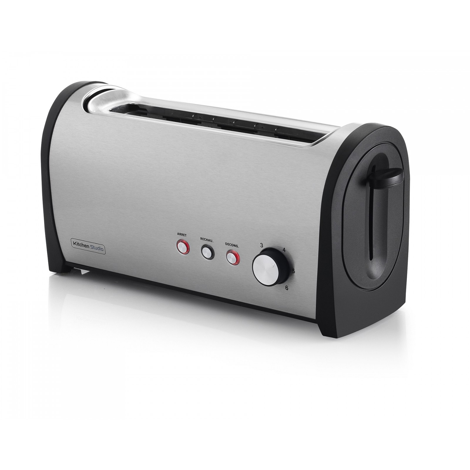 Grille-pain 1 fente Inox - Kitchen Studio - Large fente (25 cm x 4,2 cm) qui s'adapte à tous les types de pains : 2 toasts ou morceaux de baguettes coupés en deux - Thermostat variable avec 6 niveaux de brunissage - Fonctions Décongélation pour griller directement du pain congelé et Réchauffage - Remontée automatique du pain - Tiroir ramasse-miettes - Range-cordon sous l'appareil - Corps finition Inox brossé - Dimensions 39 x 15 x 19.3 cm - Puissance 1000 W - Garantie 2 ans.