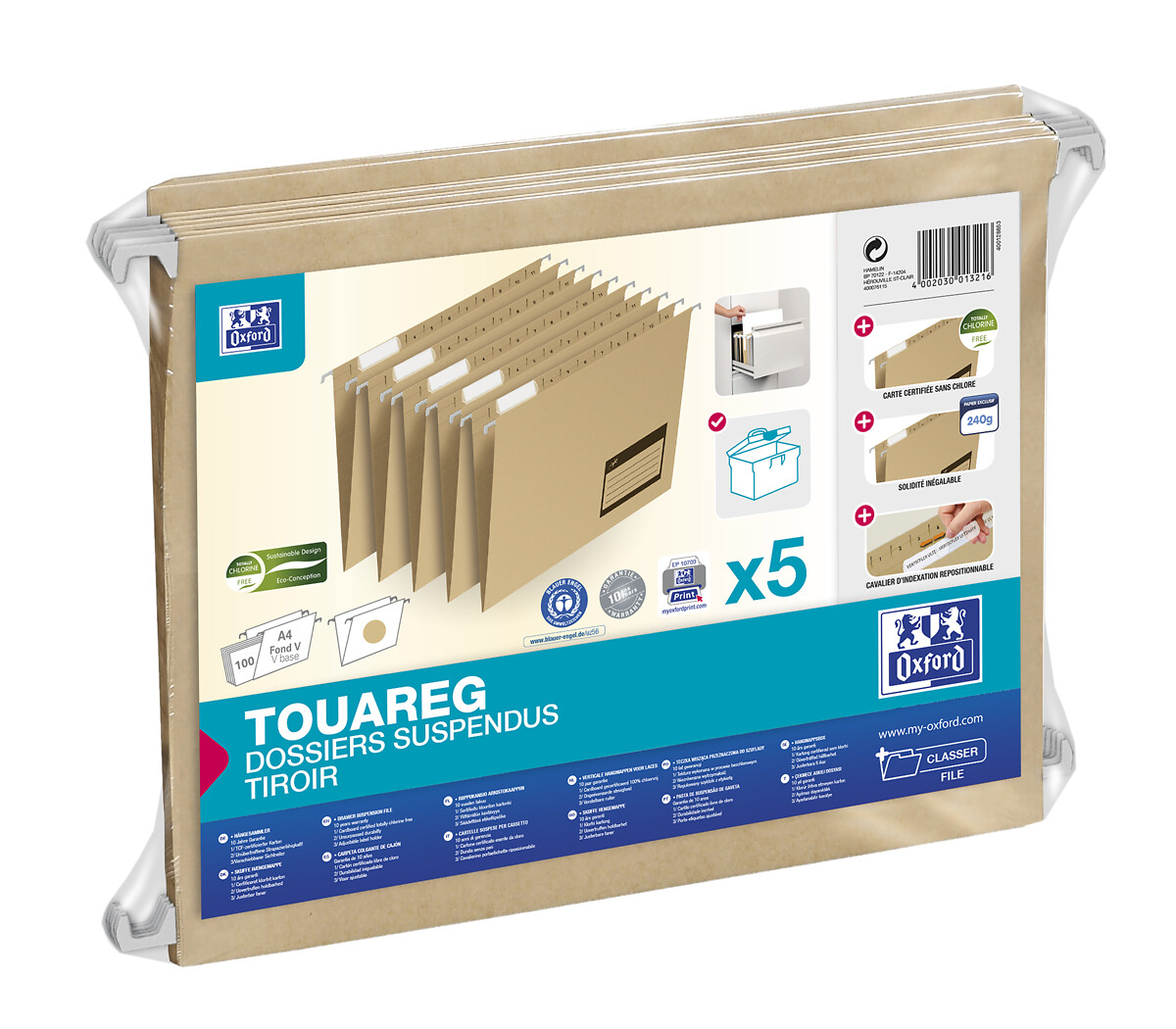 Optez pour ce lot de 5 dossiers suspendus Oxford Touareg A4, et alliez l'utilité à l'écologie, sans compromettre la qualité et la résistance. Un choix idéal pour tous les professionnels.