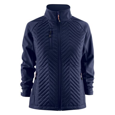 Veste softshell matelassée façon doudoune. Parties latérales, manches raglan et col en softshell (tissu 1). Intérieur de la veste en micropolaire sur les parties latérales, les manches et le col. Face avant et dos avec coutures en chevron (tissu 2). Une poche poitrine et deux poches latérales zippées. Tires-zips de couleur contrastée sur le zip principal et les poches latérales. Dos de la veste plus long pour une meilleure protection. Manches ajustées avec poignets velcro réglables. Bande de propreté contrastée.