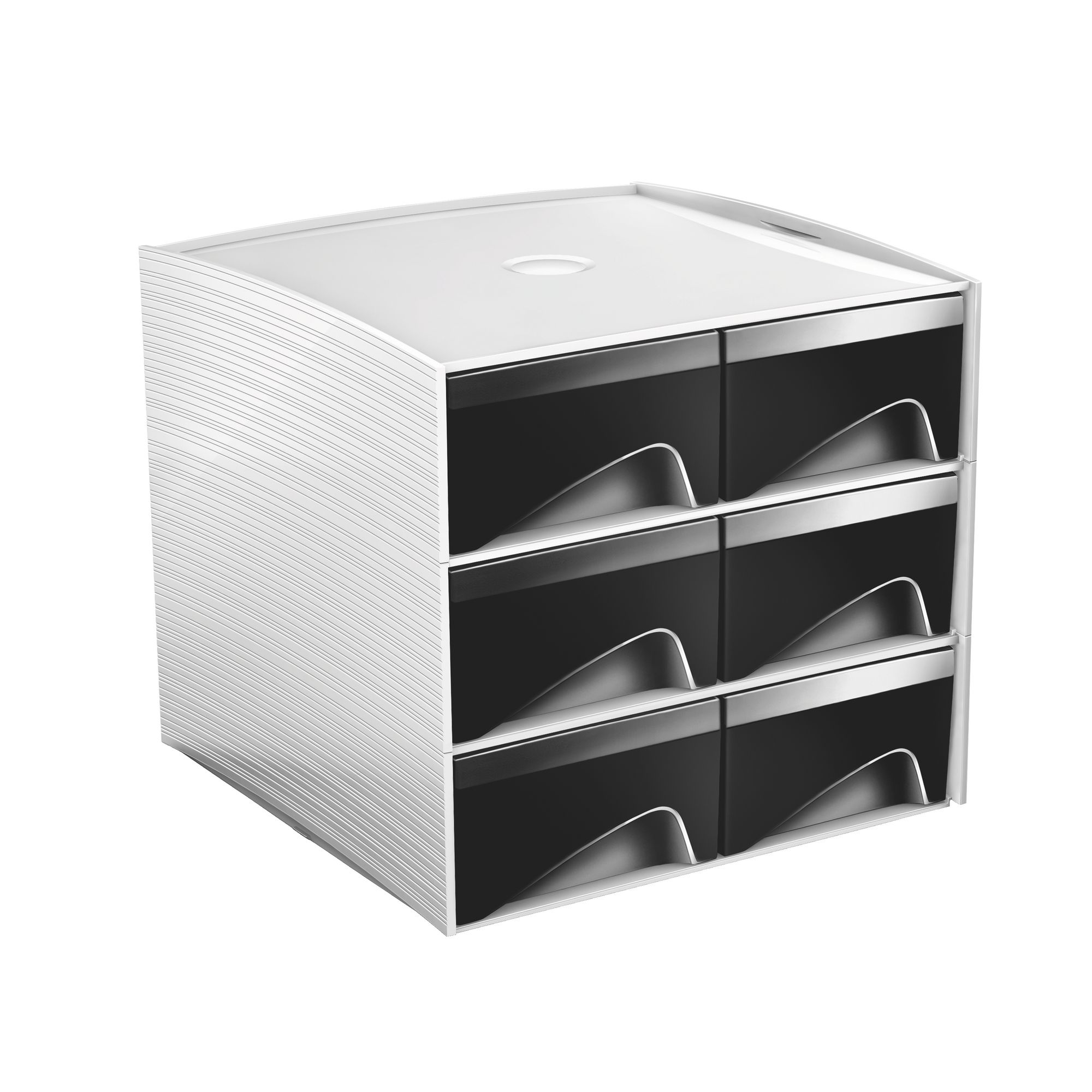 Description détailléePour ajouter un espace de rangement supplémentaire mais de petite taille sur votre bureau.Idéal pour ranger vos petits accessoires et vos fournitures. Poignées ergonomiques en creux facilitant l’ouverture des tiroirs. 6 tiroirs avec butées d’arrêt pour éviter qu’ils ne basculent. Dimensions utiles d'un tiroir : H 4,2 x L 8 x P 15,7 cm.Possibilité de superposer plusieurs modules. Patins anti rayures et antidérapants. En plastique polystyrène 100 % recyclable et fabriqué à partir de 38% de matière recycléeSocle blanc, tiroirs noirs.