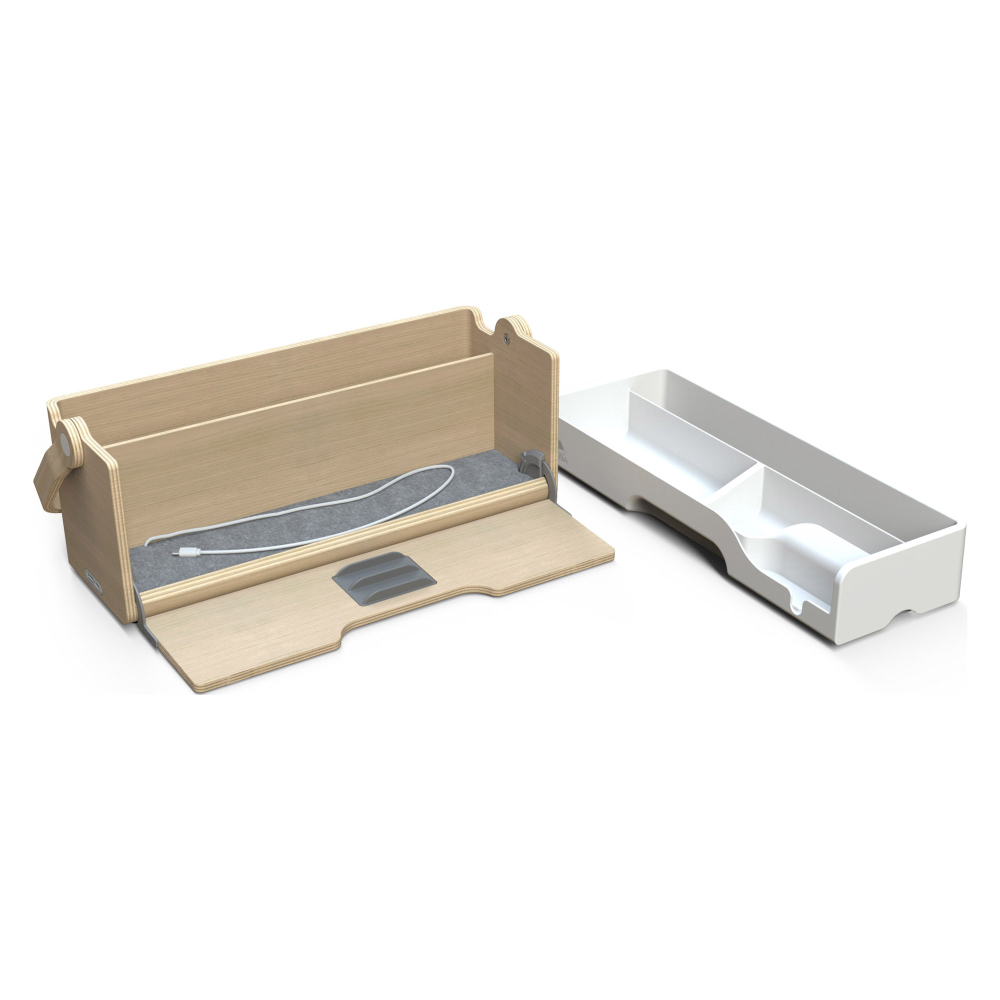 Il est composé de 2 modules qui se séparent pour bénéficier d'un vrai espace de travail nomade : un module bois comme rehausseur d'écran pour pc portable (jusqu'à 15 pouce ) et un module blanc pour le téléphone ou tablette