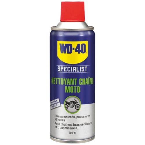 Le nettoyant chaïne moto, Specialist de 400 mL de la marque WD40 est un dégraissant dispersible dans l'eau conçu pour solubiliser les graisses et les huiles récentes, oxydées ou anciennes. Adapté pour être ensuite rincé à l'eau froide. Il ramollit et solubilise toutes les huiles et les graisses. Rapide et facile à rincer. Il s'applique sur les surfaces métalliques, les plastiques rigides thermodurcissables et toutes les applications mécaniques.