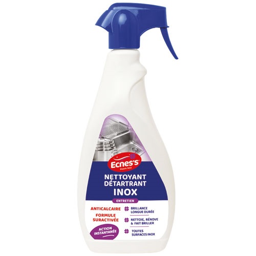 Description détailléeNettoie, rénove et fait briller toutes les surfaces en inox : évier, hotte, plan de travail, casserole Convient pour les inox lisses ou brossés. Action instantanée.Anticalcaire.Spray de 750 ml.