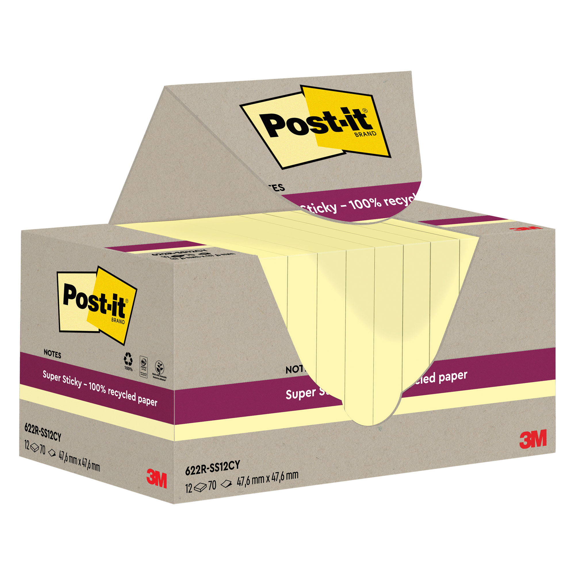Blocs de Notes Post-it® Super Sticky 100% recyclées. Sans emballage individuel, en boîte distributrice 100% en carton recyclé mono-couleur pour limiter l'usage d'encre. La tour est composée de 12 blocs jaune pastel de 70 feuilles. Le papier est certifié 100% PEFC. L'adhésif des notes est fabriqué avec 60% de ressources renouvelables.