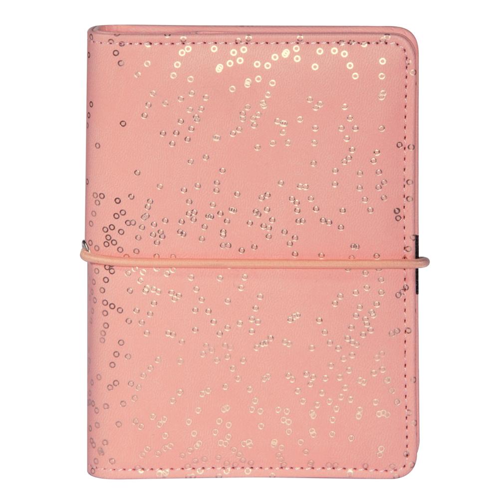 Un organiseur bijou tendance. Couverture au toucher doux avec marquage cuivré. Fermeture élastique à l'horizontale.