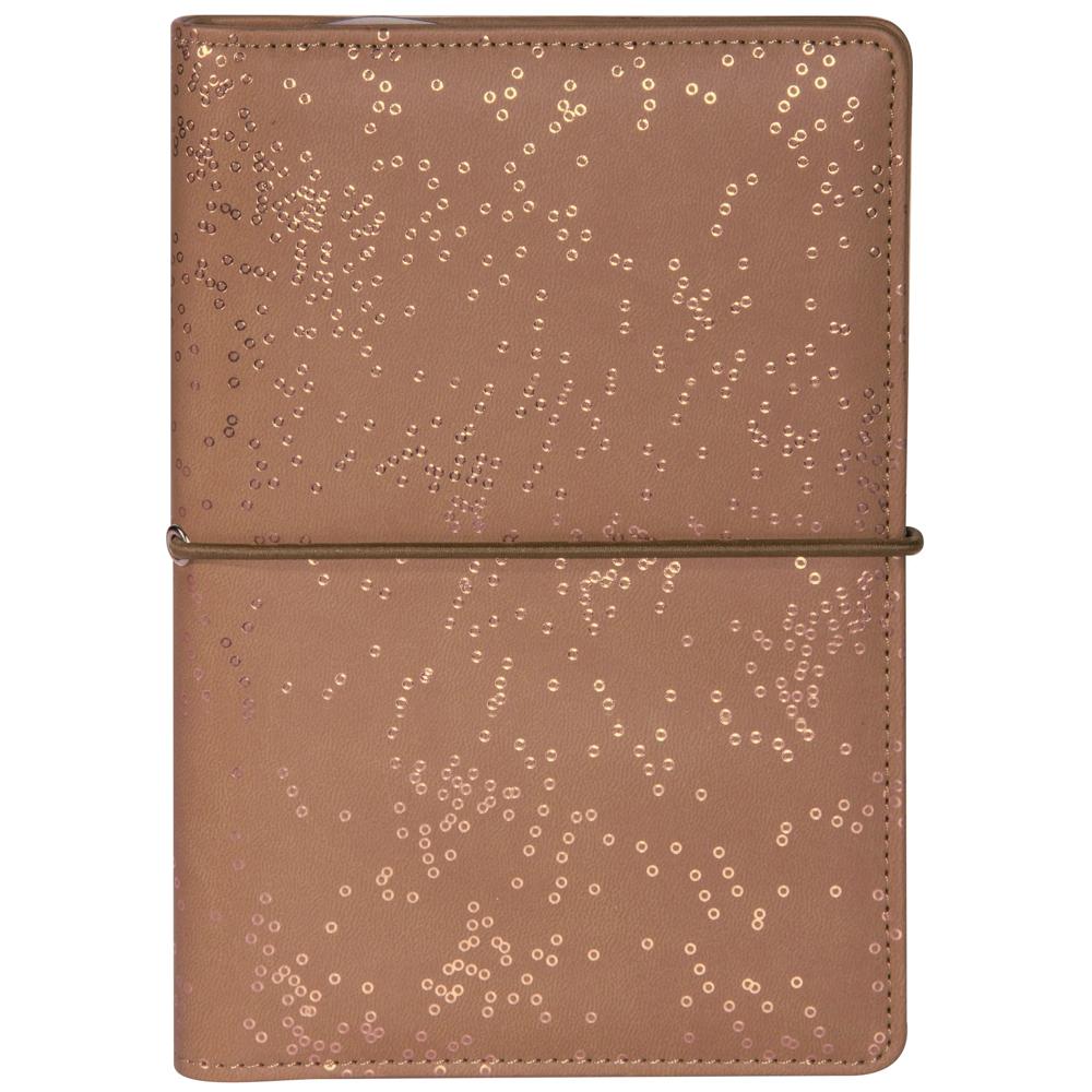 Un organiseur bijou tendance. Couverture au toucher doux avec marquage cuivré. Fermeture élastique à l'horizontale.