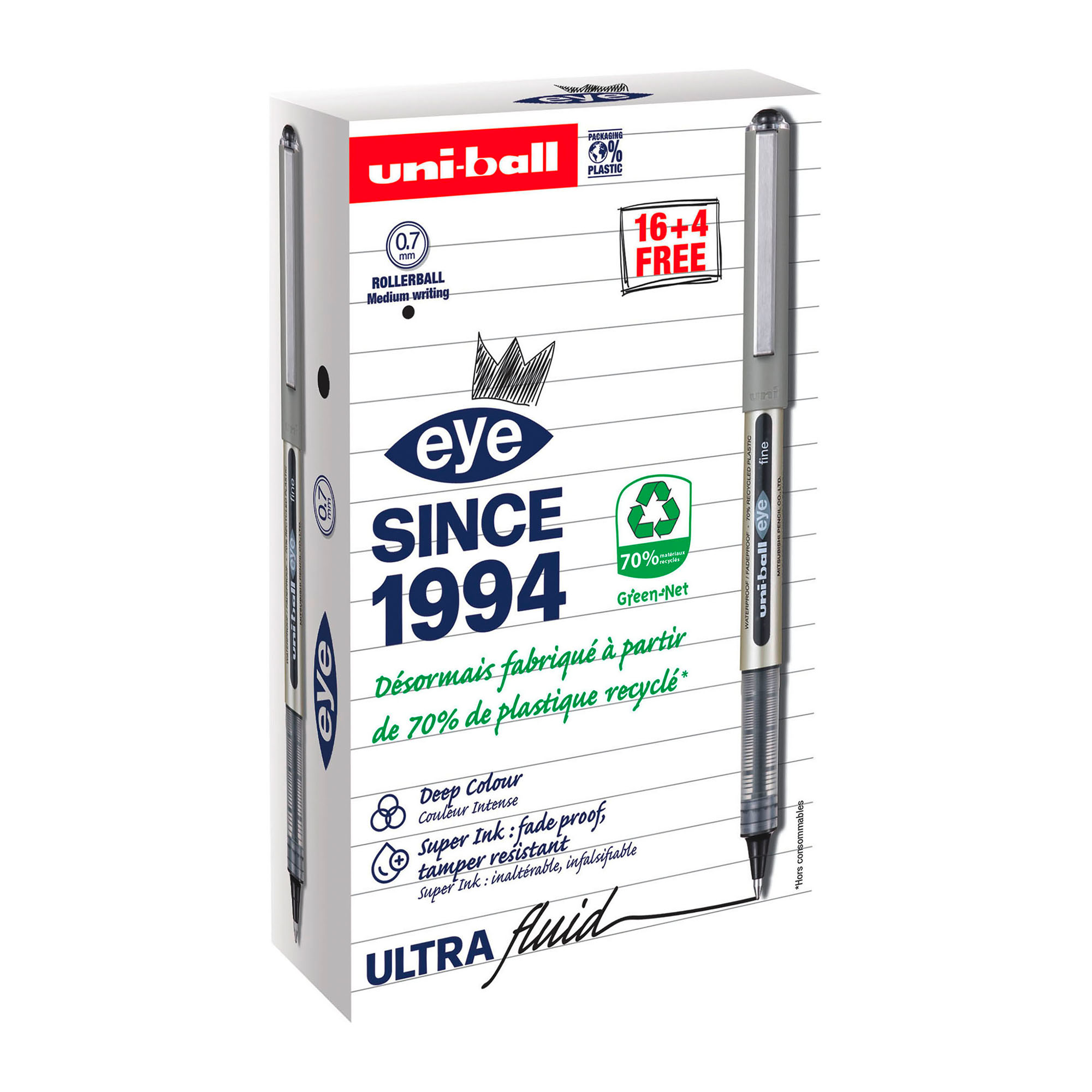 Description détailléeLot de 20 rollers encre liquide dont 4 offerts.Technologie uni flow©Trait continu sans interruption.Écriture propre sans bavure ni coulure.Encre à base de pigments pour des couleurs intenses et lumineuses.Sécurité + : encre inaltérable et infalsifiable. Elle résiste à l'eau et aux solvants.Pas d'effacement dans le temps.Niveau d'encre toujours visible. Pointe en acier inoxydable 0,7 mm.