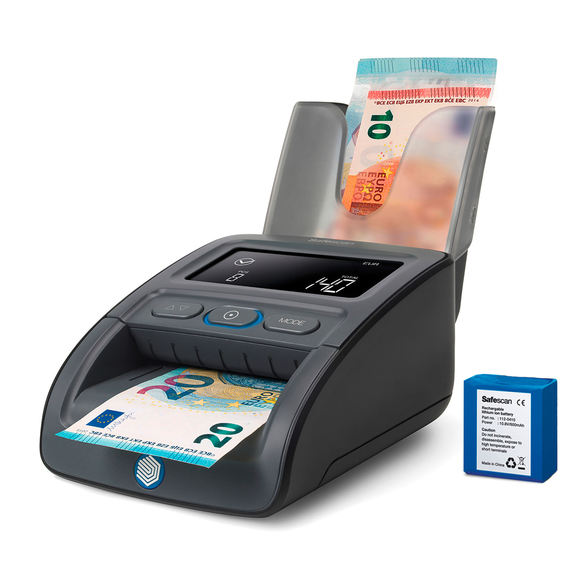 Le Safescan 155-S peut vérifier, compter et collecter vos billets de banque quand et où vous le souhaitez, grâce à la batterie Safescan LB-105 et à l’empileur de billets Safescan RS-100 inclus. La vérification, le comptage et la gestion des billets de banque sont ainsi plus faciles et plus flexibles que jamais
