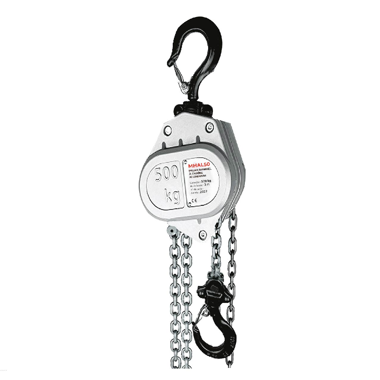 Palan Manuel en Aluminium MHAL.L'outil de Levage Idéal pour des Applications Intensives. Le palan manuel en aluminium à chaîne en acier est un dispositif de levage conçu pour faciliter le déplacement de charges allant jusqu'à 500 kg, sur une hauteur de 3 mètres. Sa structure légère et ergonomique, résultant de l'utilisation de l'aluminium, le rend facilement maniable tout en préservant une esthétique soignée. C'est l'allié imparable pour des utilisations intensives grâce à sa robustesse et à son mécanisme de levage performant, supportant 2,5 fois sa capacité nominale. Les crochets métalliques équipés de verrous sécurisés et la chaîne en acier renforcent la sécurité de l'appareil. Le système de décélération et la double roue régulatrice assurent un fonctionnement fluide et fiable, tandis que le boitier haute résistance protège les composants internes. Idéal pour divers secteurs industriels comme l'automobile, la construction navale, et la métallurgie, le palan MHAL trouve aussi son utilité dans le bâtiment, les ateliers, la logistique et l'événementiel. Pour des informations techniques détaillées, veuillez consulter la documentation téléchargeable.