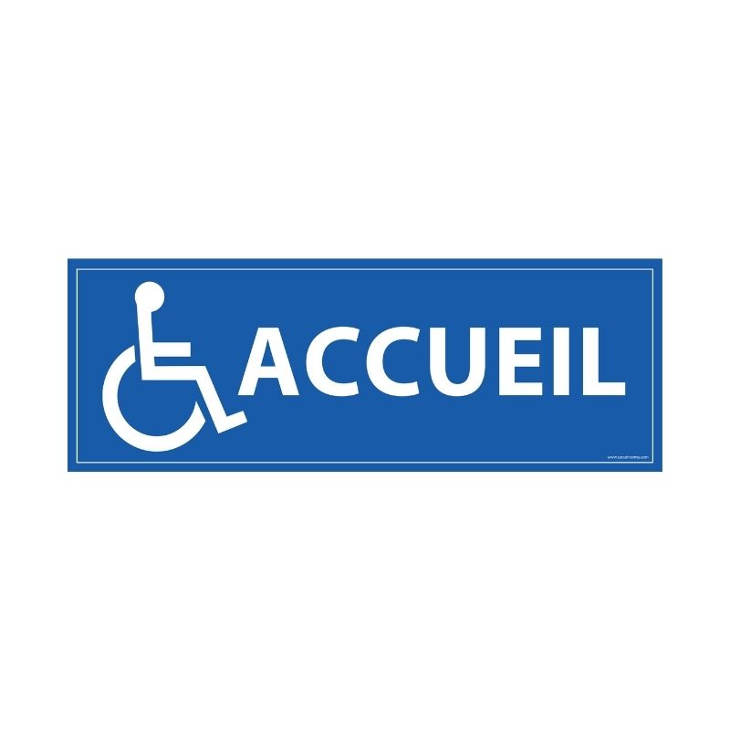 Disponible en bleu, existe en pvc, ce panneau de signalisation d'information «Accueil» contenant le texte "Accueil" et le pictogramme Handicapé en blanc; standard, attirant et compréhensible, il indique aux personnes à mobilité réduite où se diriger afin de trouver l'accueil de votre établissement recevant du publique ERP.Caractéristiques: :Matière : PVC ou vinyleUsage : intérieurCouleur du fond : BleuCouleur du Texte : BlancDimensions :210 x 75 mm Rappel de la loi :Pour etre conforme à la réglementation Accessibilité Handicap, la signalisation doit etre:Visible : la lecture doit pouvoir se faire en position debout ou assise. Si le panneau est placé à moins de 2,2 m de hauteur, on doit pouvoir s'en approcher à au moins 1 m.Lisible : le contraste des couleurs du panneau doit etre suffisant. La taille des caractères doit assez grand (4.5mm minimum, 15mm pour une information d'orientation)Compréhensible : on utilise un pictogramme normalisé si il en existe.