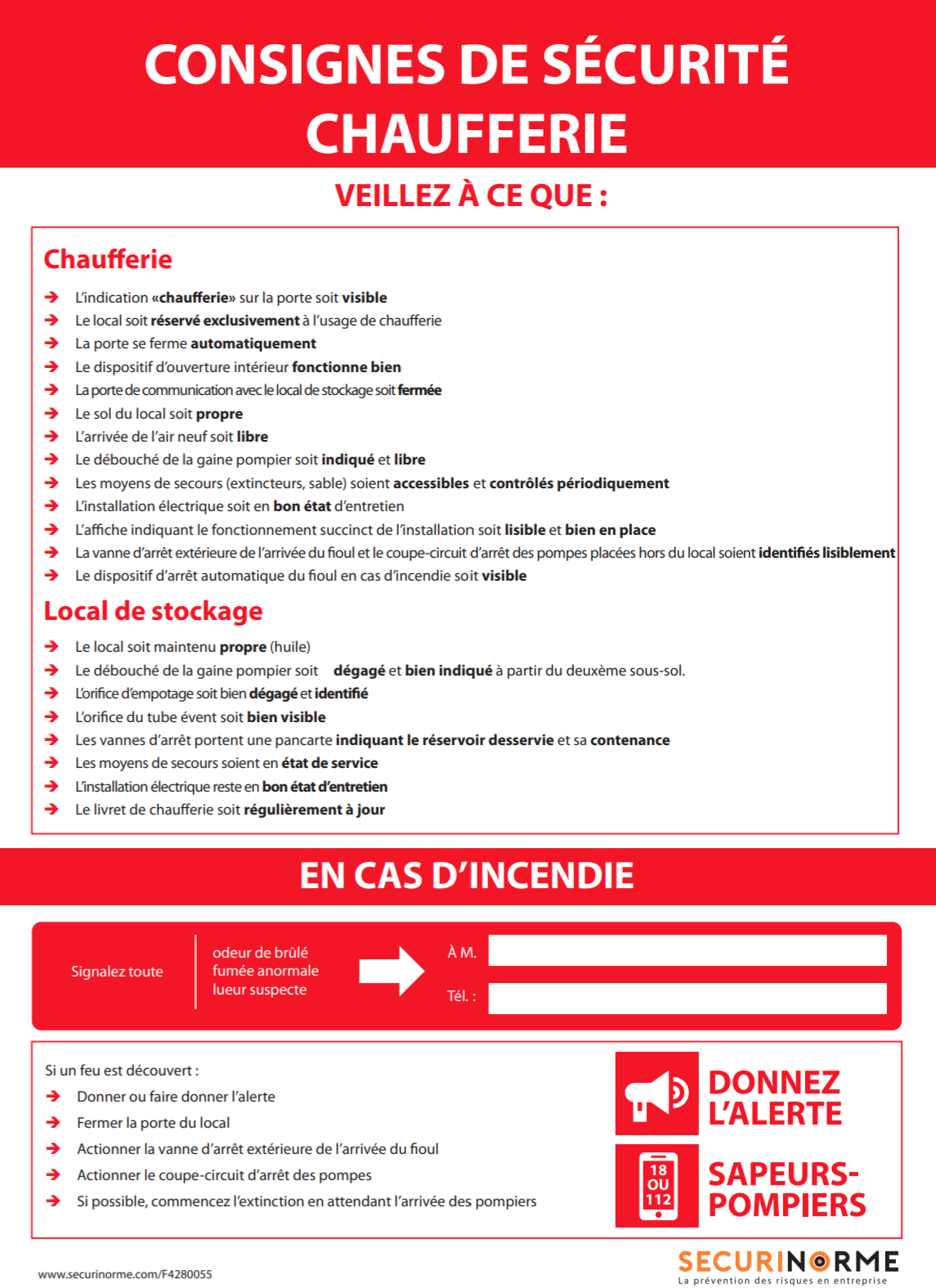 Parmi les consignes de sécurité à respecter dans une chaufferie, on trouve notamment : la visibilité de l'indication «chaufferie» sur la porte, l'usage exclusif du local pour la chaufferie, la fermeture automatique de la porte, le bon fonctionnement du dispositif d'ouverture intérieur, la propreté du sol et du local, la vérification régulière des moyens de secours (extincteurs, sable), le contrôle de l'installation électrique, et bien d'autres encore.
