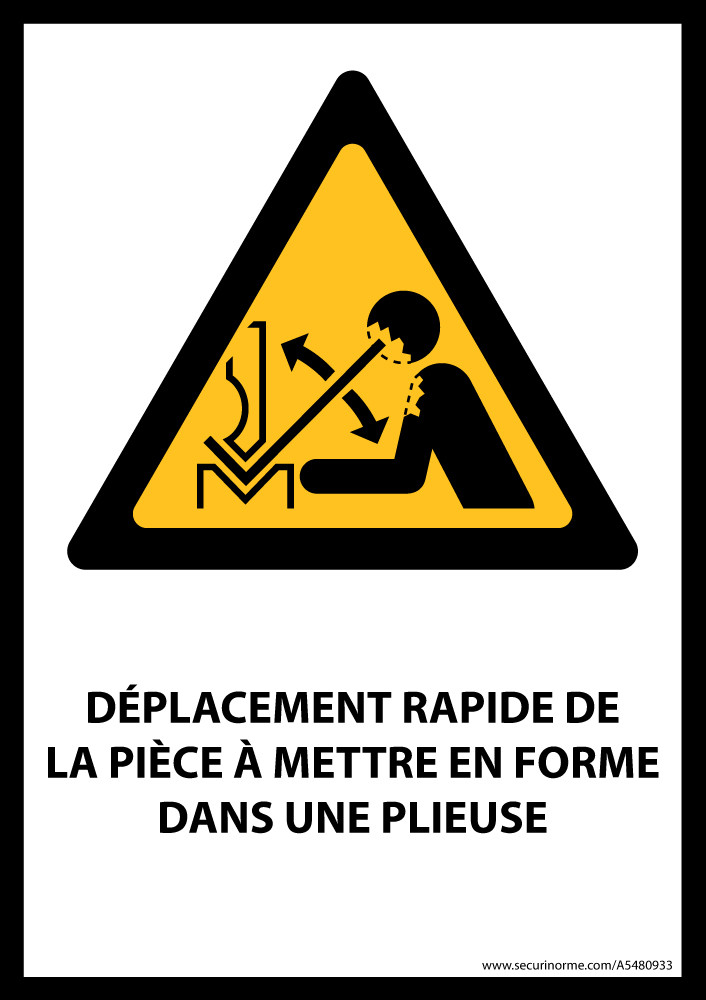 Ce pictogramme met en garde contre les risques liés au déplacement rapide de la pièce à mettre dans une presse plieuse. Pour une protection optimale, il est important d'identifier ces zones à risque au moyen d'un tel panneau.