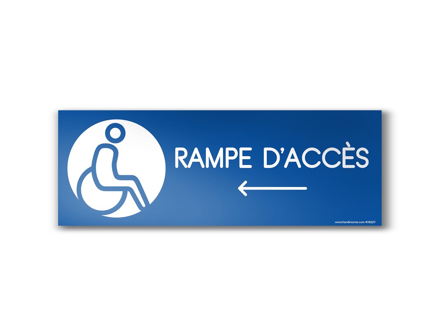 Optez pour ce Panneau Design - Rampe D'accès - Flèche Gauche + Picto Handicapé, conçu pour faciliter la visibilité des rampes d'accès destinées aux personnes en situation de handicap et à mobilité réduite (PMR). Ce panneau est parfait pour les établissements recevant du public (ERP), les parkings d'entreprise, les hôtels et autres lieux publics où l'accessibilité est primordiale.