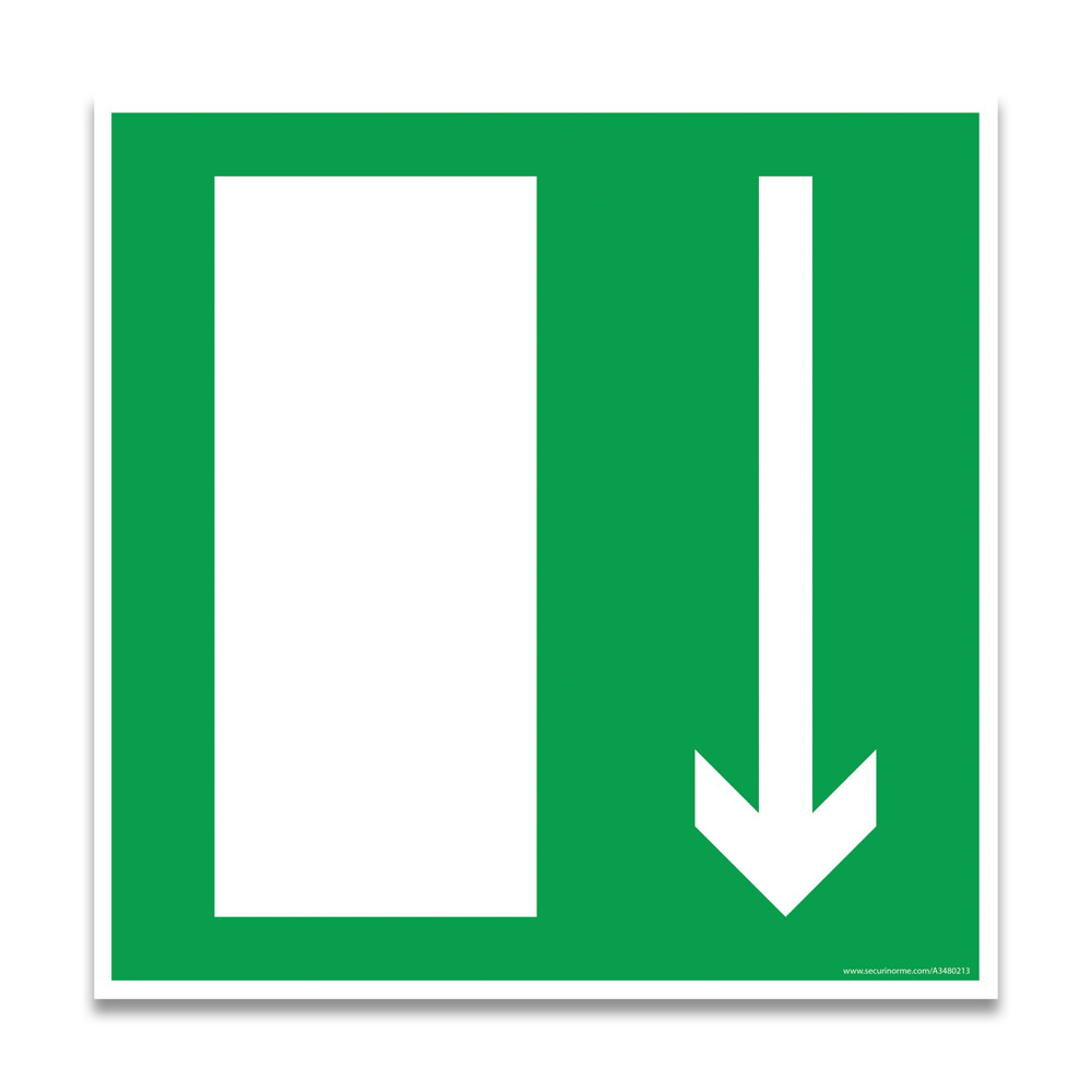 Optez pour le Panneau D'évacuation Et De Secours Carré - Issue De Secours, Flèche Directionnelle En Bas Ou En Haut, un élément essentiel pour assurer la sécurité dans les lieux publics tels que les hôtels, les salles de spectacles et les centres commerciaux. Ce pictogramme est conforme à la norme ISO EN 7010, obligatoire depuis le 1er janvier 2014, qui harmonise la signalétique de sécurité à l'international pour une compréhension optimale.