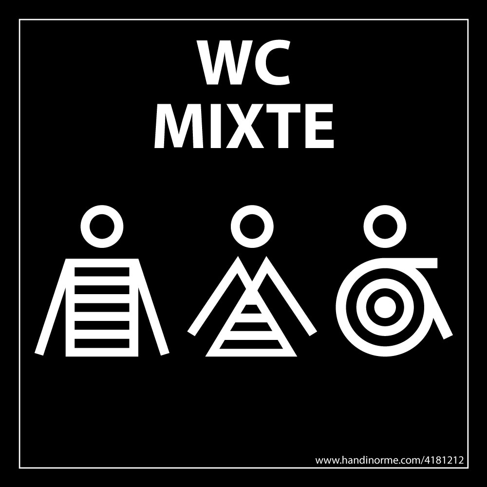 D'une hauteur de 125 mm et d'un format carré de 125 x 125 mm, ce panneau arbore un fond noir et un design marinière élégant, mettant en avant le logo PMR ainsi que les pictogrammes homme et femme, accompagné du texte ""wc mixte"". Grâce à cette signalétique, vous pourrez guider vos clients et employés vers les sanitaires adaptés en toute simplicité.