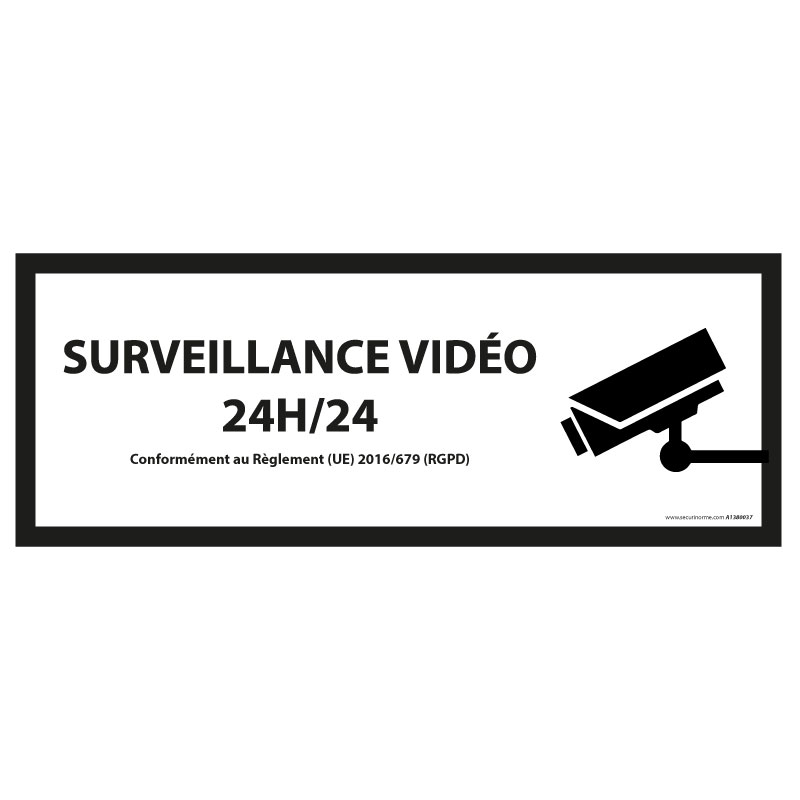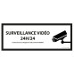 La couleur du fond est à choisir entre le blanc et le gris, tandis que le pictogramme et le texte sont en noir pour une lisibilité optimale. Le pictogramme représente une caméra, indiquant clairement la présence d'un dispositif de surveillance.