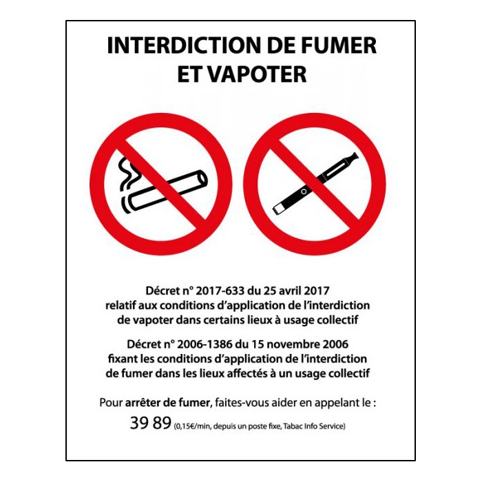 Cette signalétique permet d'indiquer dans tous les lieux publics les zones où il est interdit de vapoter ou fumer. Il présente aussi les deux décrets d'interdiction datant du 15 Novembre 2006 et du 25 Avril 2017.