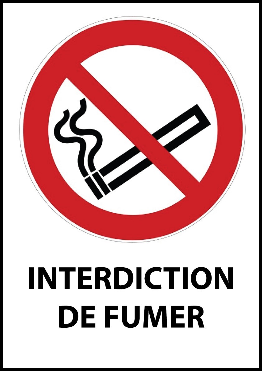 Le panneau est de forme rectangulaire et de couleur rouge sur fond blanc, avec un pictogramme ISO 7010 P002 noir représentant l'interdiction de fumer. La norme ISO 7010, obligatoire depuis le 1er janvier 2014, vise à harmoniser la signalisation de sécurité au niveau international pour assurer une compréhension universelle.