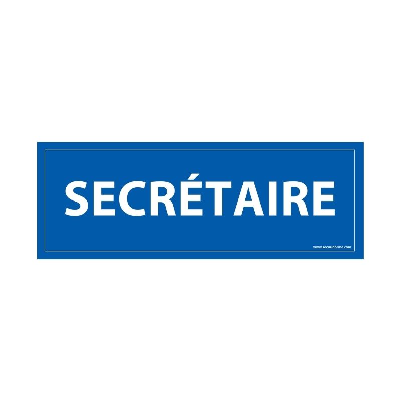 Disponible en bleu, existe en vinyle adhésif souple et en PVC, ce panneau de signalisation d'information pour bureau «Secrétaire» contenant le texte "Secrétaire" en blanc; standard, attirante et compréhensible cette plaque de porte aide les usagers de votre établissement recevant du publique ERP à identifier le bureau de secrétaire.Caractéristique du Panneau de signalisation et d'information interne "Secrétaire" :Matière : Vinyle adhésif, PVCUsage : intérieurCouleur du fond : BleuCouleur du Texte : BlancDimensions :210 x 75 mm Rappel de la loi :Pour etre conforme à la réglementation Accessibilité Handicap, la signalisation doit etre:Visible : la lecture doit pouvoir se faire en position debout ou assise. Si le panneau est placé à moins de 2,2 m de hauteur, on doit pouvoir s'en approcher à au moins 1 m.Lisible : le contraste des couleurs du panneau doit etre suffisant. La taille des caractères doit assez grand (4.5mm minimum, 15mm pour une information d'orientation)Compréhensible : on utilise un pictogramme normalisé si il en existe.
