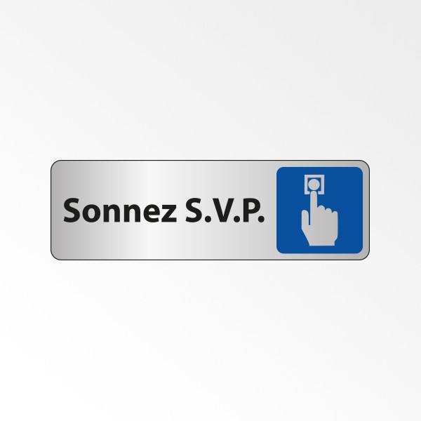 Deux formats sont disponibles - 150 x 47 mm et 250 x 80 mm - ainsi que deux matériaux : PVC avec un fond blanc, ou Metallex avec un fond argenté. Le texte ""Sonnez S.V.P."" est inscrit en noir, tandis que le pictogramme de la sonnette est décliné en blanc sur fond bleu pour le PVC, et en argenté sur fond bleu pour le Metallex.