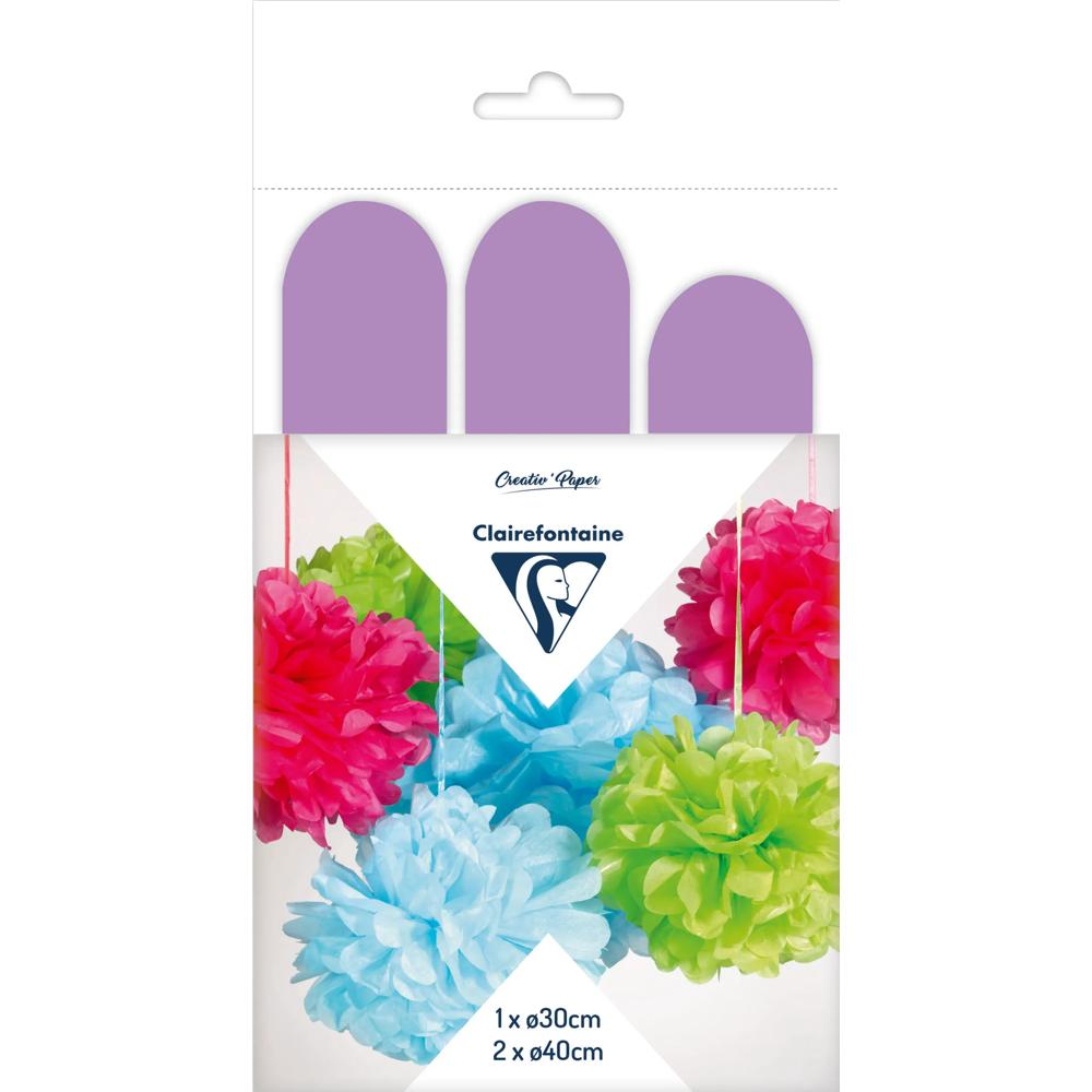 Ce set contient 3 pompons à suspendre, 2 pompons de 30cm de diamètre et 1 pompon de 40cm de diamètre.