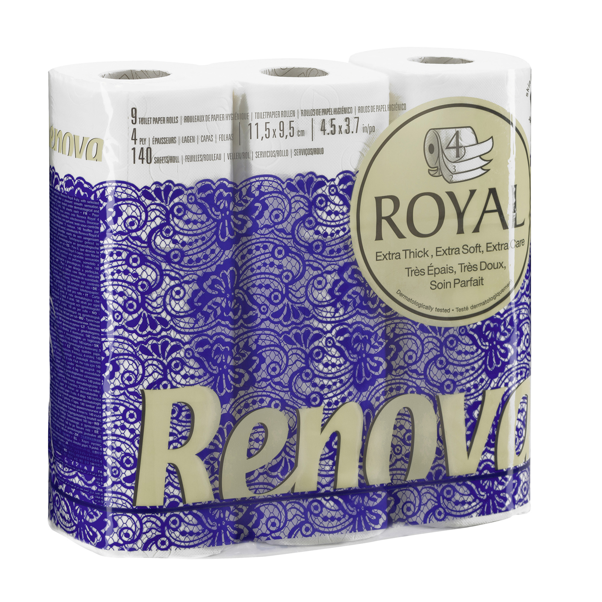 Description détailléeRoyal Renova est un papier toilette très doux, en pure ouate blanche.De 4 épaisseurs, ses feuilles sont résistantes aux déchirures pour un essuyage efficace.Colis de 63 rouleaux (soit 7 x 9 rouleaux).Rouleau de 140 feuilles,
