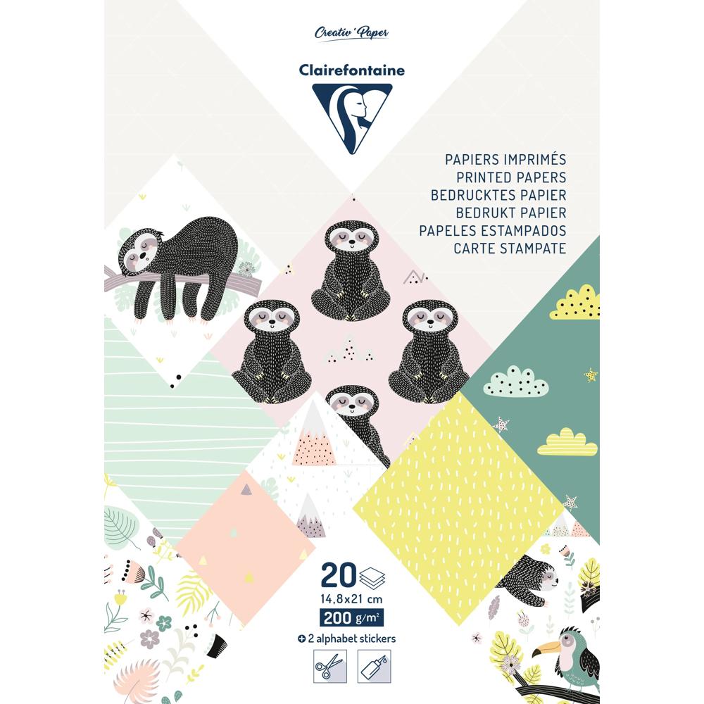 Ce bloc contient 18 feuilles à motifs (9 motifs répétés 2 fois) au format A5 (14,8x21cm) imprimées au recto sur un papier de 200g/m². A cela s'ajoute 2 planches d'étiquettes à découper ainsi que 2 planches de stickers alphabet.