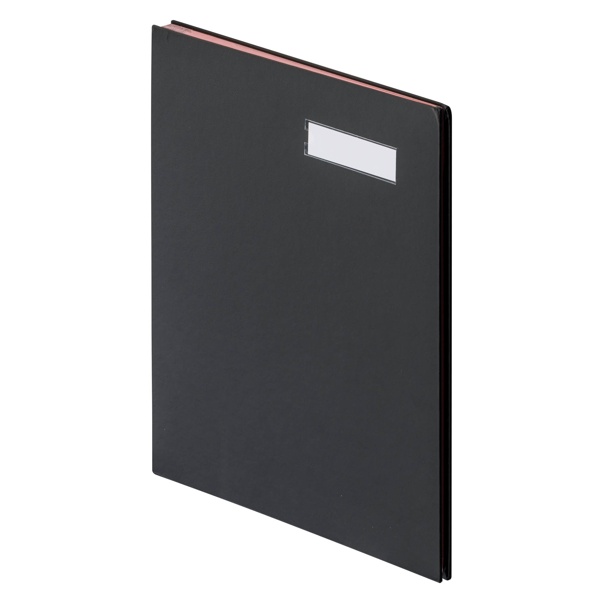 La couverture carton fort 20/10° recouverte de Balacron est munie d’un porte-étiquettes avec bristol. L’intérieur est en véritable buvard rose 240 g/m².- très pratique, le dos de ce carnet est extensible renforcé