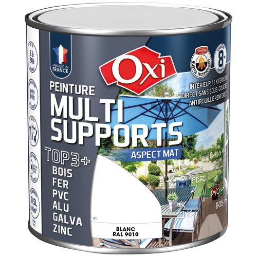La peinture mat multi-support TOP3 de 500 mL en coloris blanc RAL9010 de la marque Oxi est destinée à la décoration et la protection de nombreux matériaux bois, fer, PVC, métaux non ferreux, intérieurs et extérieurs. TOP3+ est une formule solvantée composée de résines de qualité supérieure et renforcée grâce à la « RUSTOL Technology ». Sur BOIS, TOP3+ est microporeux et protège de l'humidité, il s'oppose, sans cloquer, au vieillissement et à la dégradation des bois neufs ou anciens : volets, menuiseries, portails, bardages… Sur fer, TOP3+ est anticorrosion, il pénètre le métal rouillé pour en chasser l’humidité, il donne une résistance exceptionnelle contre la corrosion : portails, ferronneries, tuyauteries, bardages, chaudronnerie… Pour de multiples supports, TOP3+ s’oppose à la dégradation des matériaux, permet leur rénovation et leur décoration. Ses qualités d’accrochage permettent une application sur presque tous les supports : PVC, plastiques, galva, zinc, ciment, briques, enduits… Technique mais polyvalente, la formule de TOP3+ est issue d’une formulation professionnelle éprouvée depuis plus de 20 ans dans des conditions très difficiles, sa formulation de qualité est renforcée grâce à « RUSTOL Technology » qui permet une adhérence, une pénétration et une isolation exceptionnelle de tous les supports. S’applique sur supports sains, propres, secs et dégraissés, la plupart du temps sans sous-couche. Supprimer les particules friables par grattage, ponçage ou brossage. Cette peinture s'applique généralement en 1 couche en rénovation. Pour une protection optimale, les supports non peints pourront recevoir 2 couches fines. Appliquez chaque couche de façon régulière et en croisant les passes. Outils : pinceau, rouleau laqueur ou pistolet professionnel. Sec au toucher de 8 à 12 heures, 2ème couche après 24 heures minimum. Nettoyage des outils avec le diluant Universel CR10 ou White-Spirit.