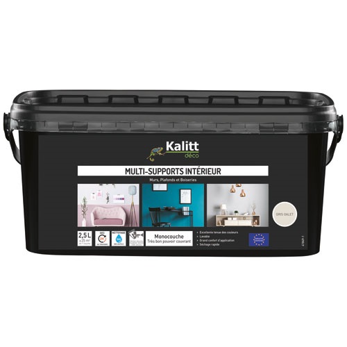 La peinture acrylique mat multi-supports de 2.5 L en coloris gris galet de la marque KALITT DECO est une peinture polyvalente monocouche pour intérieur avec un effet mat velouté, idéale pour décorer et rafraîchir votre habitat. Convient à tous les supports intérieurs tels que les enduits des groupes de mortiers P II et P III, les enduits de plâtre du groupe de mortiers P IV, les plaques de béton/fibrociment, les plaques de plâtre cartonné, les tissus de verre, les non-tissés de verre et de cellulose, le papier ingrain ainsi que les papiers peints structurés ou en papier et pour recouvrir d’anciennes couches de peinture à base de dispersion intactes. Avec son pouvoir trés couvrant le rendement est d'environ 125 mL /m² par couche sur supports lisses, légèrement absorbants. La consommation est plus élevée sur des supports rugueux. Complètement sec après environ 4 jours. Le temps de séchage est augmenté à basse température et/ou par humidité de l’air plus élevée. Conseil de préparation : Le support doit être solide, sec, propre, porteur et exempt d’efflorescence, de couches frittées, d’agents de séparation, de composants favorisant la corrosion ou d’autres couches intermédiaires qui interfèrent avec l’adhésion. Conseil de stockage : Toujours au sec et au frais, mais à l’abri du gel. Garder les contenants ouverts hermétiquement fermés.