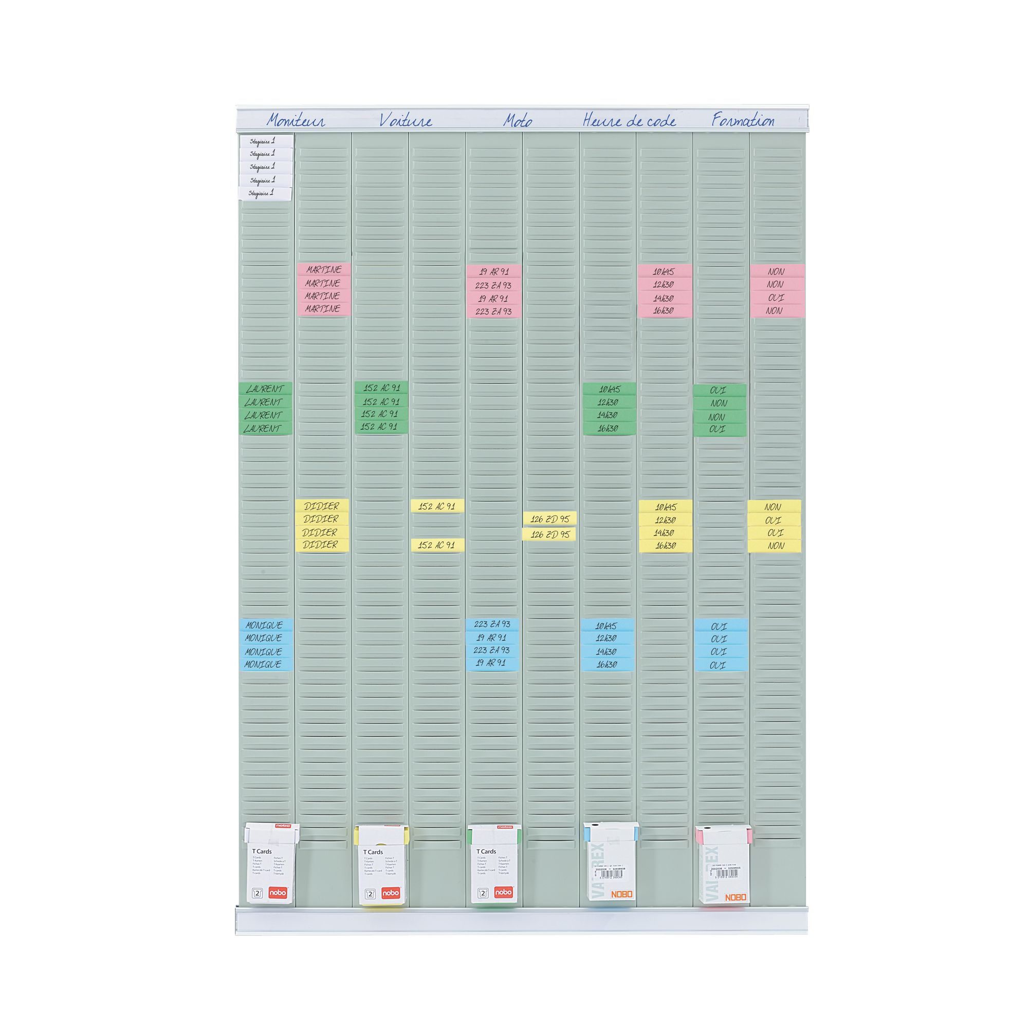 Gérez efficacement votre emploi du temps et vos ressources grâce au planning à fiches T multi-usages Nobo. Ce tableau permet d’avoir une vue globale sur vos activités et vos programmes. Ce modèle comprend un panneau mural rigide capable d’accueillir 540 fiches de types T indice 2 d’une largeur de 64,5 cm chacune (non fournies avec l’article). Vous disposez de 10 colonnes avec des bandes verticales à 54 fentes emboîtées sur 2 supports. Ce planning à fiches T trouvera facilement sa place dans vos locaux.