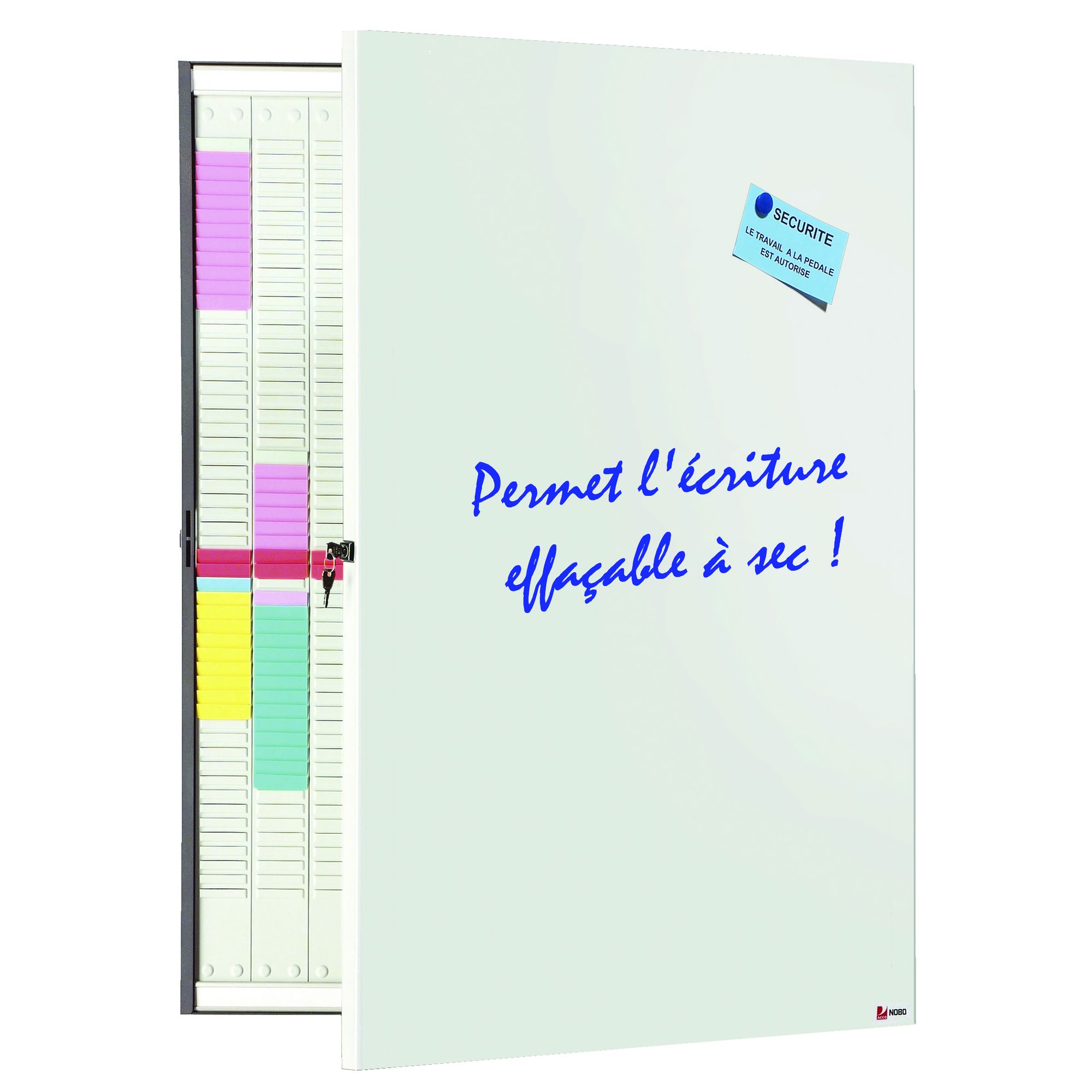Un planning bien fiché dans votre organisation. Grâce au planning T multi-usages Nobo, composé de 20 colonnes avec 54 fentes, votre planning sera rudement facilité et l'organisation renforcée. Ce planning peut contenir 1080 fiches de format T indice 2. Très pratique, ce modèle pliable se ferme à clé pour plus de confidentialité et aussi pour un gain de place. Résistant, ce planning 2 x 10 colonnes Nobo est réalisé en métal avec une surface externe laquée. En position fermée, cet accessoire peut servir de tableau blanc pour marqueurs effaçable à sec. Vous pouvez aussi l’utiliser comme tableau d’affichage grâce à sa surface magnétique. Que de fonctions utiles !