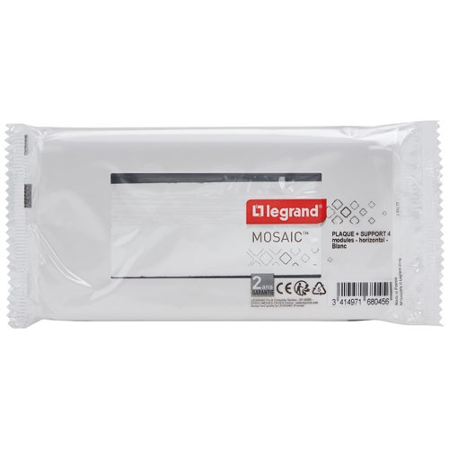 La plaque avec support pour 4 modules Mosaic montage horizontal entraxe 71 mm à composer blanc de chez Legrand. Mosaic, une plaque nouveau design répondant aux tendances actuelles, avec support intégré pour une mise en oeuvre rapide et facile, à compléter de mécanismes Mosaic. Fixation par vis dans boîte à encastrer Batibox ou existante. Reçoit les mécanismes Mosaic.