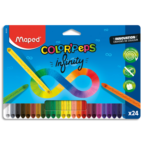 Découvrez les crayons de couleur innovants Maped Color'Peps Infinity ! Faits 100% en mine et s'utilisant de bout en bout, ces crayons ne génèrent aucun déchet. Ils s'auto-affûtent en coloriant et offrent des couleurs super lumineuses ainsi qu'une excellente couvrance. Leur forme triangulaire brevetée permet une préhension facilitée, pour une expérience de coloriage agréable et prolongée.