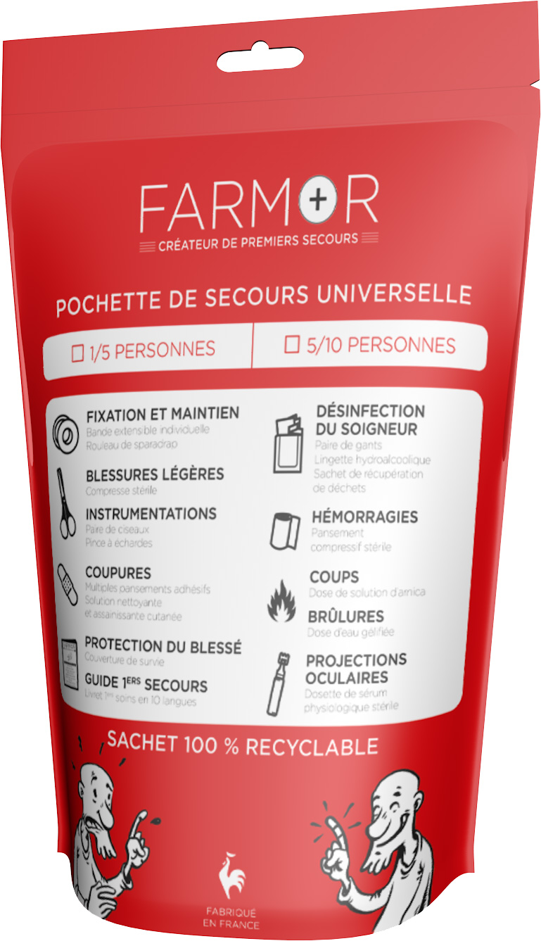 Cette composition est conçue pour répondre à tous types de risques. Elle permet d’équiper tous les secteurs d’activité et répond aux préconisations des médecins du travail. Cette pochette, avec son emballage 100% recyclable, permet de soigner :