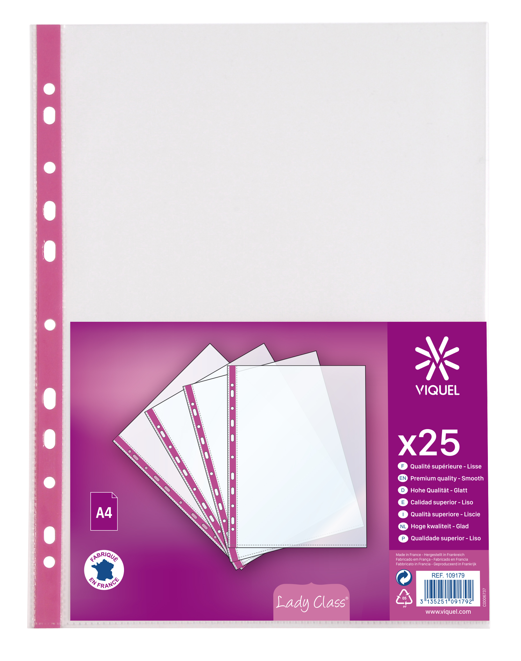 Les pochettes perforées en plastique Lady Class sont très originales avec une bande de couleur rose vif au niveau des perforations.