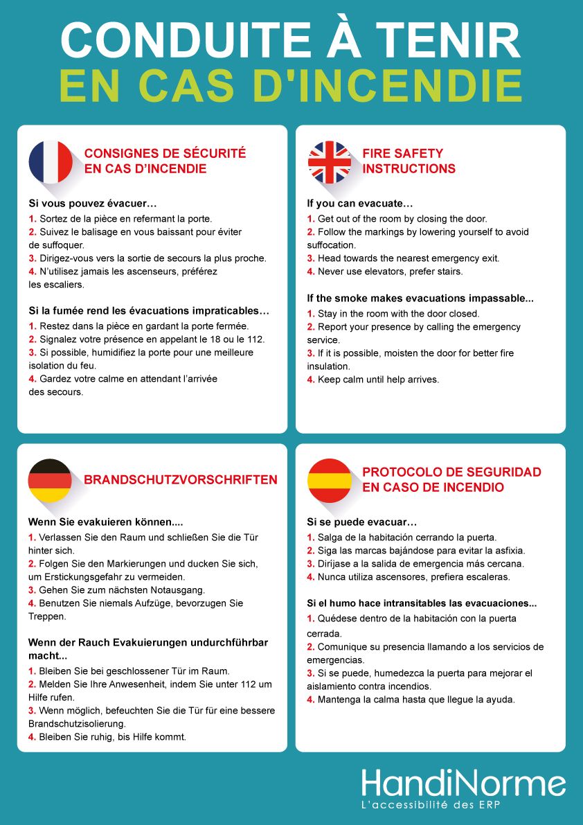 Grâce à sa matière plastifiée, ce poster résiste aux intempéries et peut être facilement fixé avec un adhésif double-face. Il vous permettra d'assurer une évacuation optimale de vos locaux en cas d'incendie. Ce poster est d'autant plus indispensable si vous recevez des clients étrangers, car il est disponible en quatre langues différentes : Français, Anglais, Allemand et Espagnol. Si vous avez besoin des consignes d'évacuation en d'autres langues, n'hésitez pas à nous demander un devis.