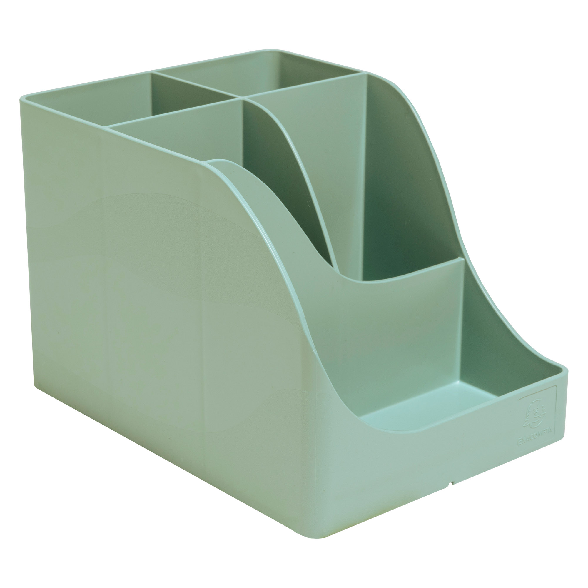 5 compartiments de hauteurs différentes : 4 compartiments hauts pour les grands ustensiles : ciseaux, stylos et 1 compartiment bas pour les petits objets tels que les trombones, les punaises, clé USB ou même son téléphone portable