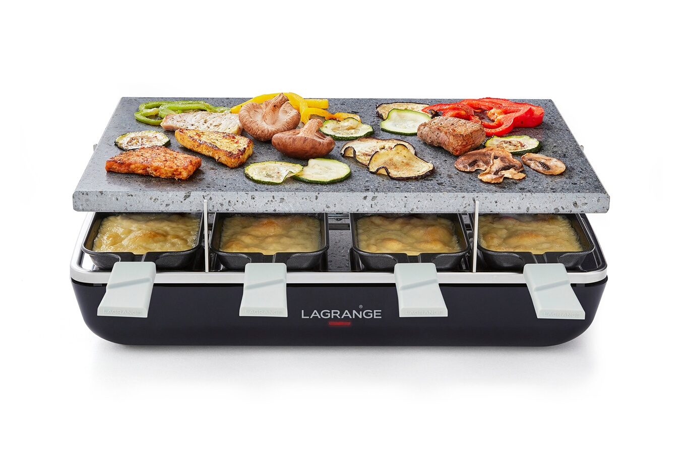 Produit conçu et assemblé en France, Multifonction : appareil doté de 2 fonctions raclette et cuisson sur pierre., Grande capacité : 8 poelons profonds pour une garniture généreuse., Facile à nettoyer : pierre amovible et poelons avec revêtement antiadhésifs.