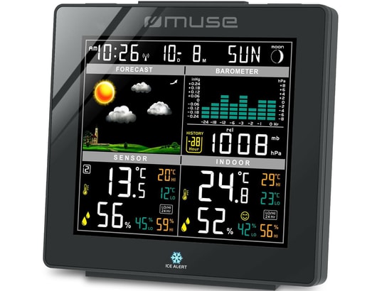 Description détailléeStation météo réveil Muse M-085 WS Noir, Calendrier, horloge et réveil, Affichage de l'historique minimax sur 24H de la température et de l' humidité, Barométre: Pression absolue et relative avec historique