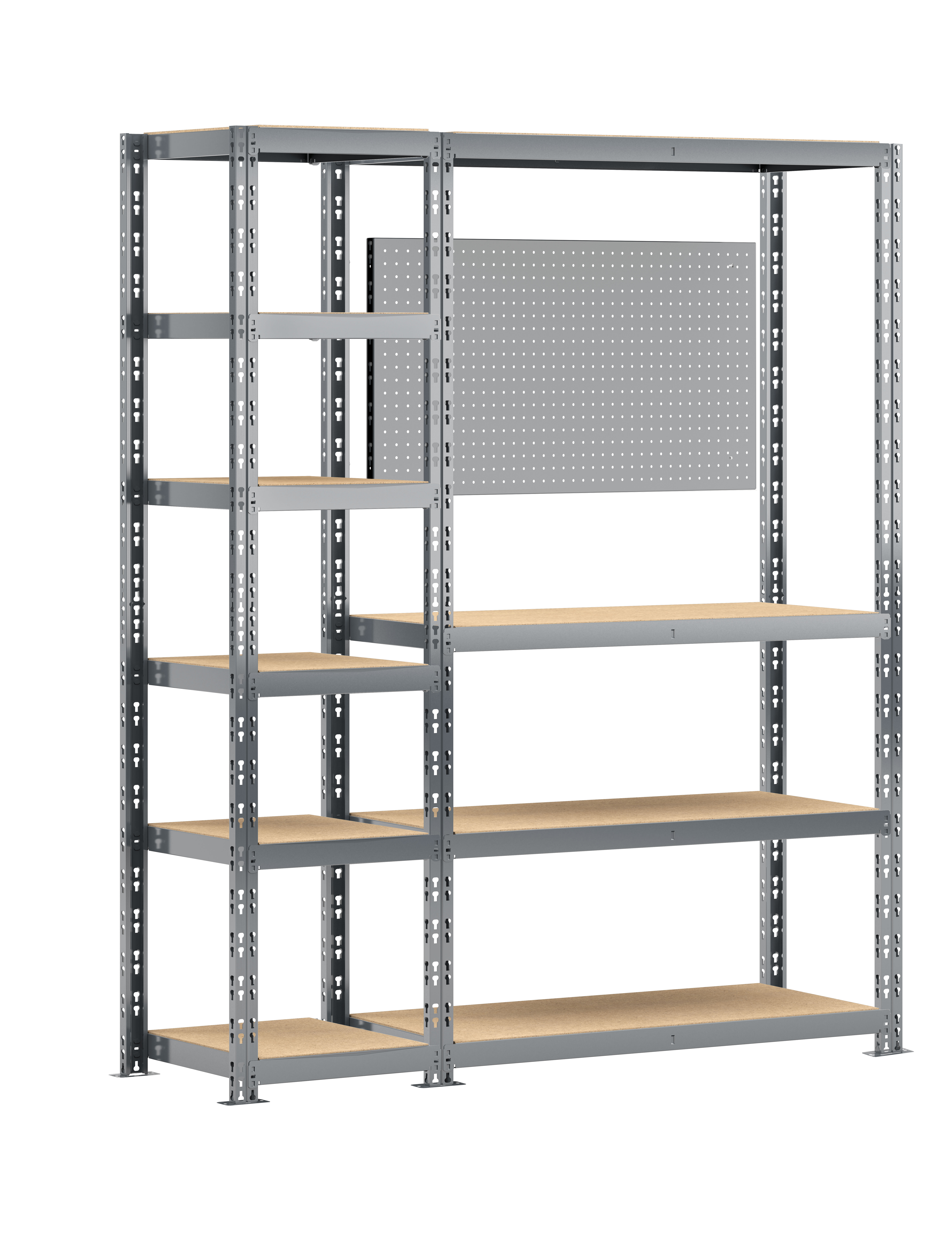Etagère double charge lourde 10 plateaux longueur 150 cm comprenant une étagère 6 plateaux 40x50xH 192 cm et une étagère établi 4 plateaux 40x100xH 192 cm livrée avec panneau porte outils - Charge lourde 250 kg/plateau - Montage facile par clipsage - Finition peinture époxy